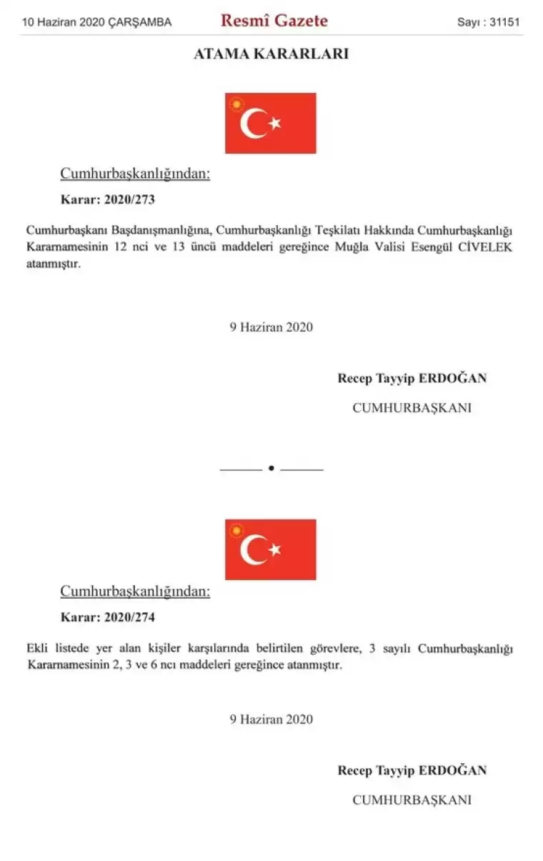 Cumhurbaşkanı Recep Tayyip Erdoğan’ın imzasıyla Resmi Gazete’de yayımlanan kararnameye göre, 41 ilin valisi değiştirildi.  18 ile yeni vali atanırken, 23 ilin vali ise yer değiştirdi. Çanakkale Valisi Orhan Tavlı Muğla Valiliğine, Muğla Valisi Esengül Civelek ise Cumhurbaşkanlığı Başdanışmanlığına atandı.