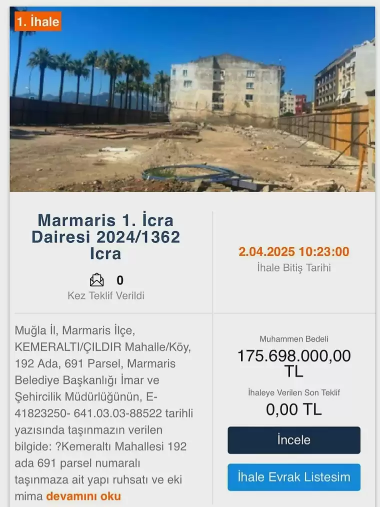 Marmaris’in en değerli noktalarından biri olan eski hizmet binası alanı için açık artırma süreci de netleşti. İhaleye katılmak isteyenler, 26 Mart 2025 saat 10:23 itibarıyla teklif vermeye başlayabilecekler. Açık artırma süreci 2 Nisan 2025 saat 10:23’te sona erecek.