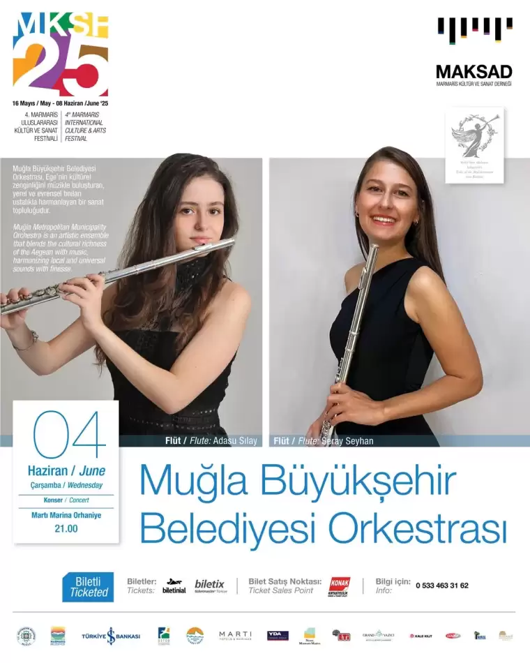 4 Haziran Çarşamba akşamı saat 21.00’de Martı Marina Orhaniye’de, 4. Uluslararası Cahit Koparal Flüt Yarışmasında dereceye giren genç sanatçılar Seray Seyhan ve Adasu Sılay’ın solist olarak yer aldığı Muğla Büyükşehir Belediyesi Orkestrası konser verecek.