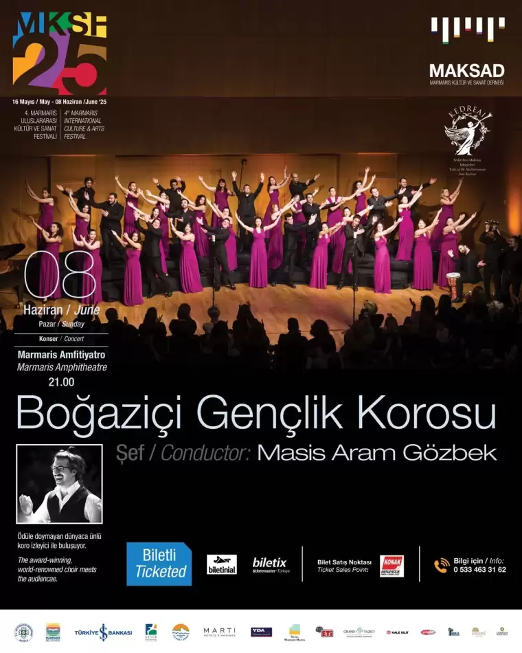 8 Haziran Pazar günü saat 21:00’de Amfi Tiyatro’da Dünya Şampiyonluğu dahil birçok uluslararası ödül kazanan Masis Aram Gözbek yönetiminde Boğaziçi Gençlik Korosu Festivalin kapanış konserini gerçekleştirecekler.