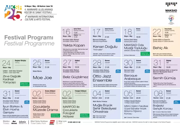 Marmaris Açıkhava Tiyatrosu’nda ve Armutalan Kültür Merkezinde düzenlenen biletli konserlerin biletleri, Biletix, Biletinial internet bilet satış siteleri ve Marmaris Konak Kırtasiye’den temin edilebilecek.