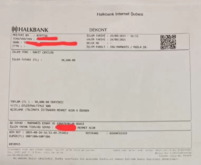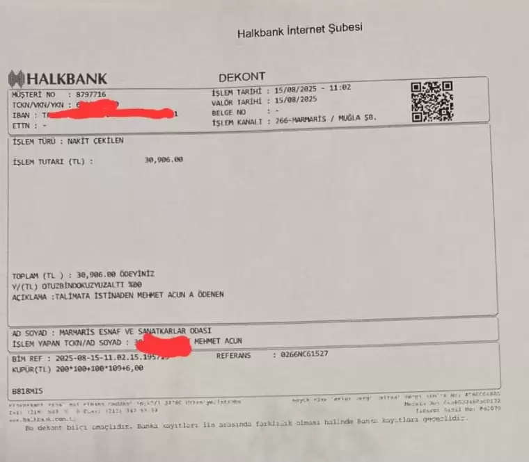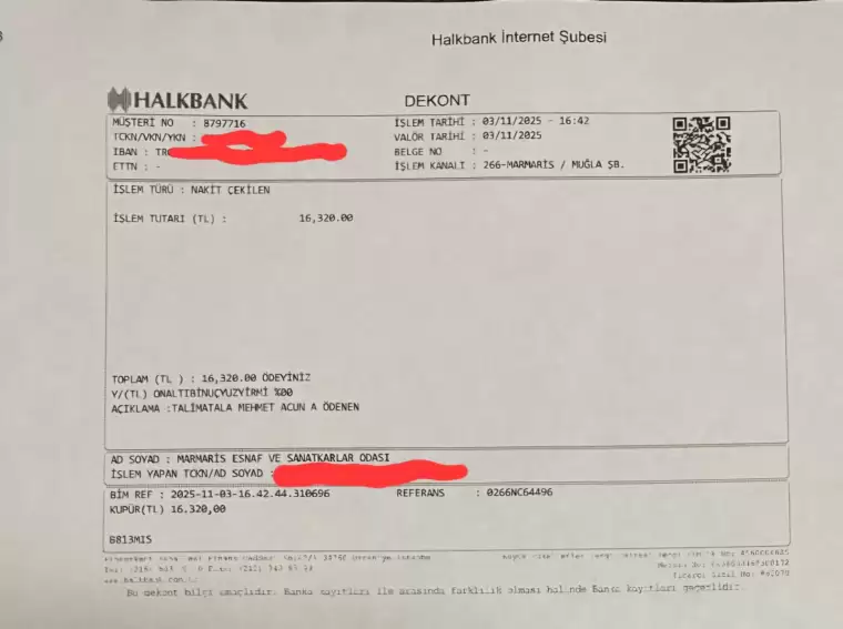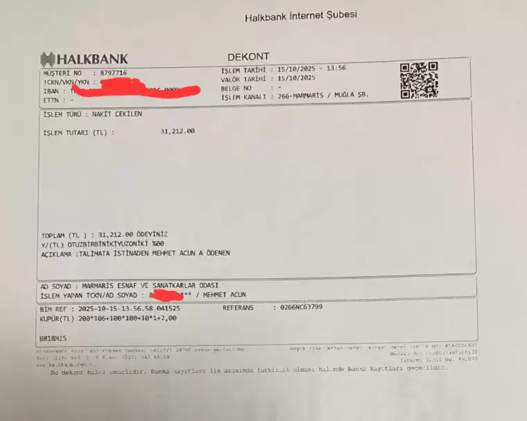 Marmaris Esnaf ve sanatkarlar odasından yapılan açıklamada 2025 yılında yapılan ödemelerin dekontları paylaşılırken 2024 yılına ait dekontların da istenildiğinde paylaşılabileceği belirtildi.
